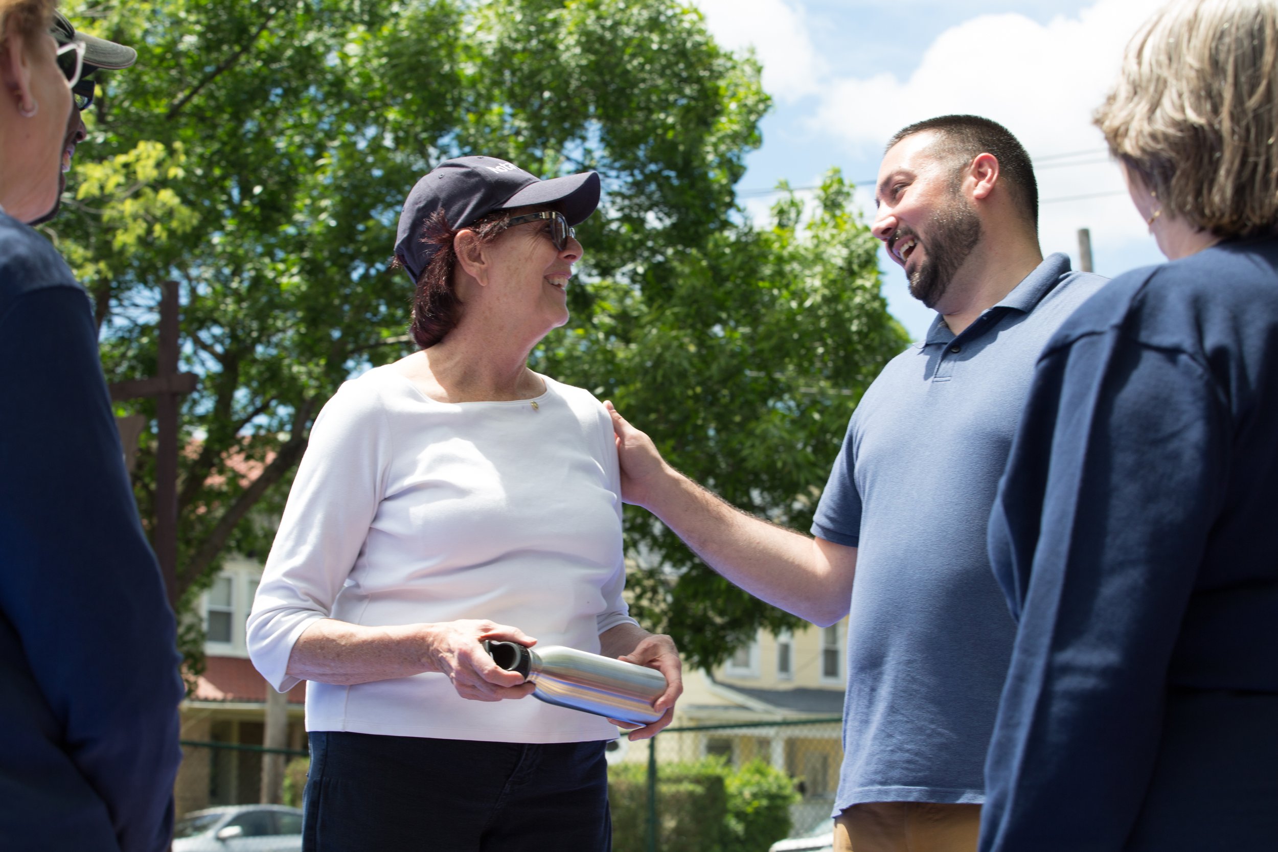 • Four people engaging in a friendly outdoor conversation, with trees and houses in the background on a sunny day.