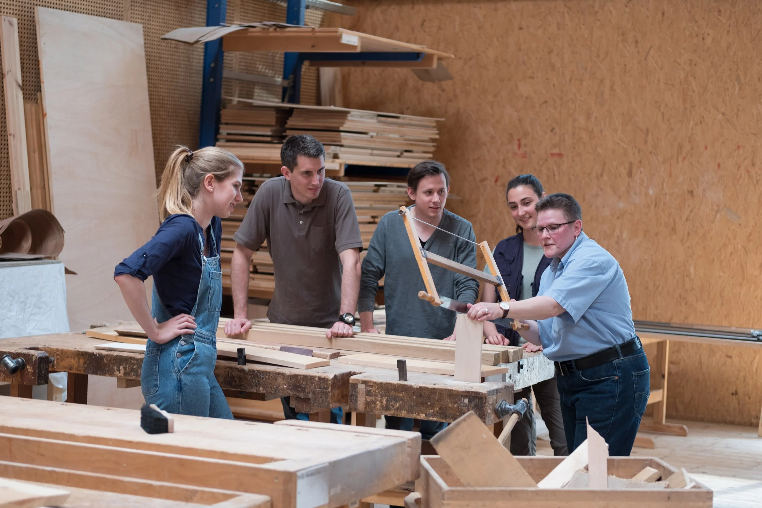 • A woodworking class with a teacher demonstrating a wooden saw to four students in a workshop with wood projects and materials.